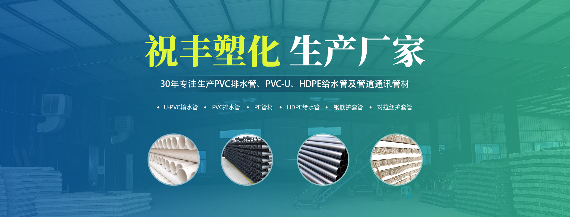 安陽市祝豐塑化有限公司坐落在滑縣工業園區,東臨大廣高速,西臨京珠高速,是鄭州、鶴壁、安陽、濮陽四個城市的輸紐,交通便利、環境優美。       公司始建于八十年代,經過二十余年的艱辛創業,規模不斷壯大,由十多萬元資產的小廠,發展到現占地面積達一萬多平,建筑面積一萬平,資產2000多萬元管材生產企業。公司生產PVC-U、PVC排水管、HDPE給水管、鋼筋護套管管道通訊管材等產品,廣泛用于農田節水、高山引水、人畜用水、建筑、電力通訊等多種用途,品種齊全。為了滿足用戶需求,可承攬各種給水、節水、灌溉工程。“祝豐塑化”憑借強勁的實力,優良的管理水平。“以質量求生存,以信譽求發展”的原則全力以赴和大家共同塑造美好未來。..